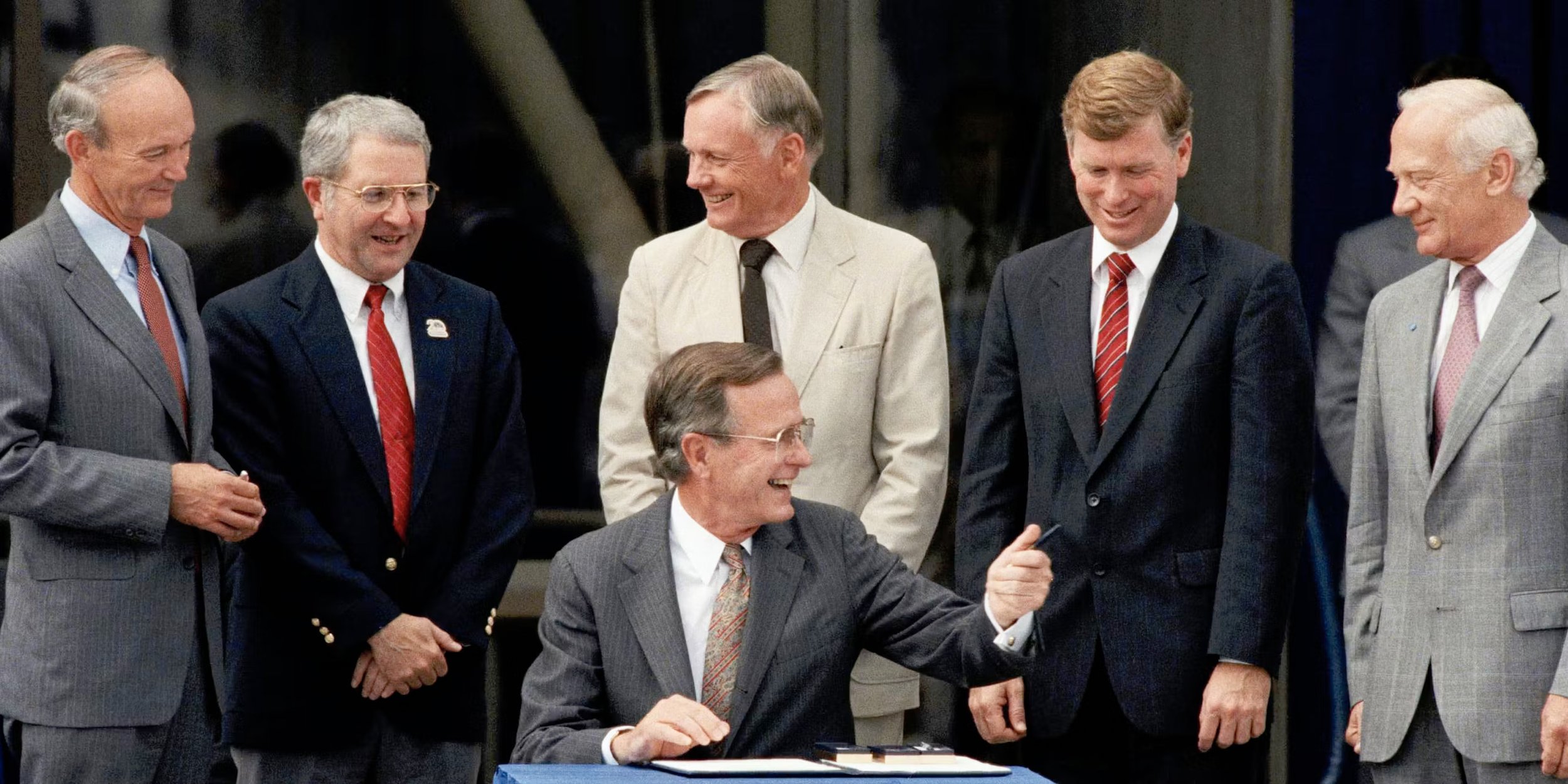 George H. Bush promotes space exploration during a ceremony marking the 20th anniversary of Apollo 11 on July 20, 1989. Behind Bush, from left: Mike Collins, NASA Administrator Richard Truly, Neil Armstrong, Dan Quayle and Buzz Aldrin. Even as I watched this on live TV, I suspected little would come of it. It just felt like the president needed something to fill a 20th anniversary commemoration event.