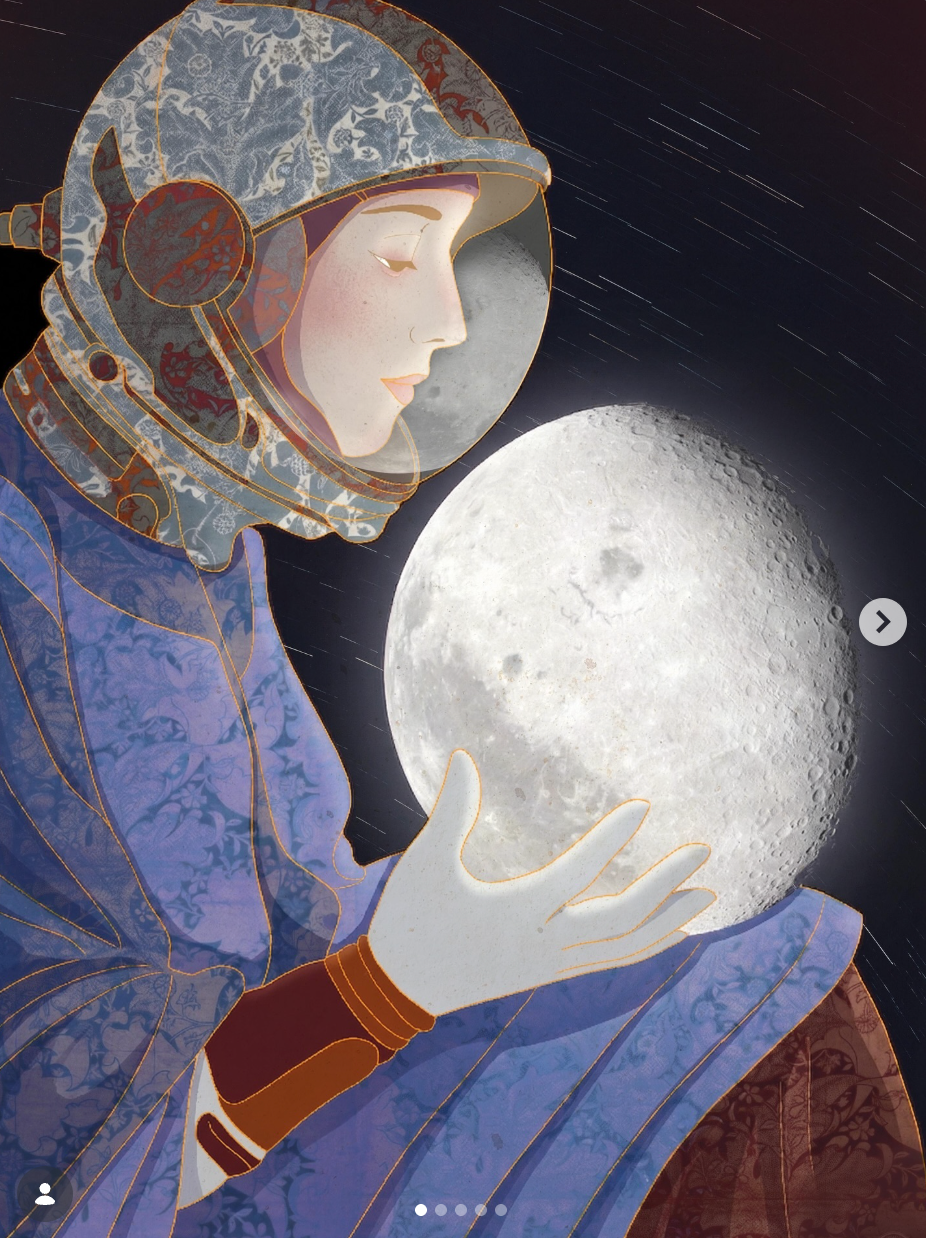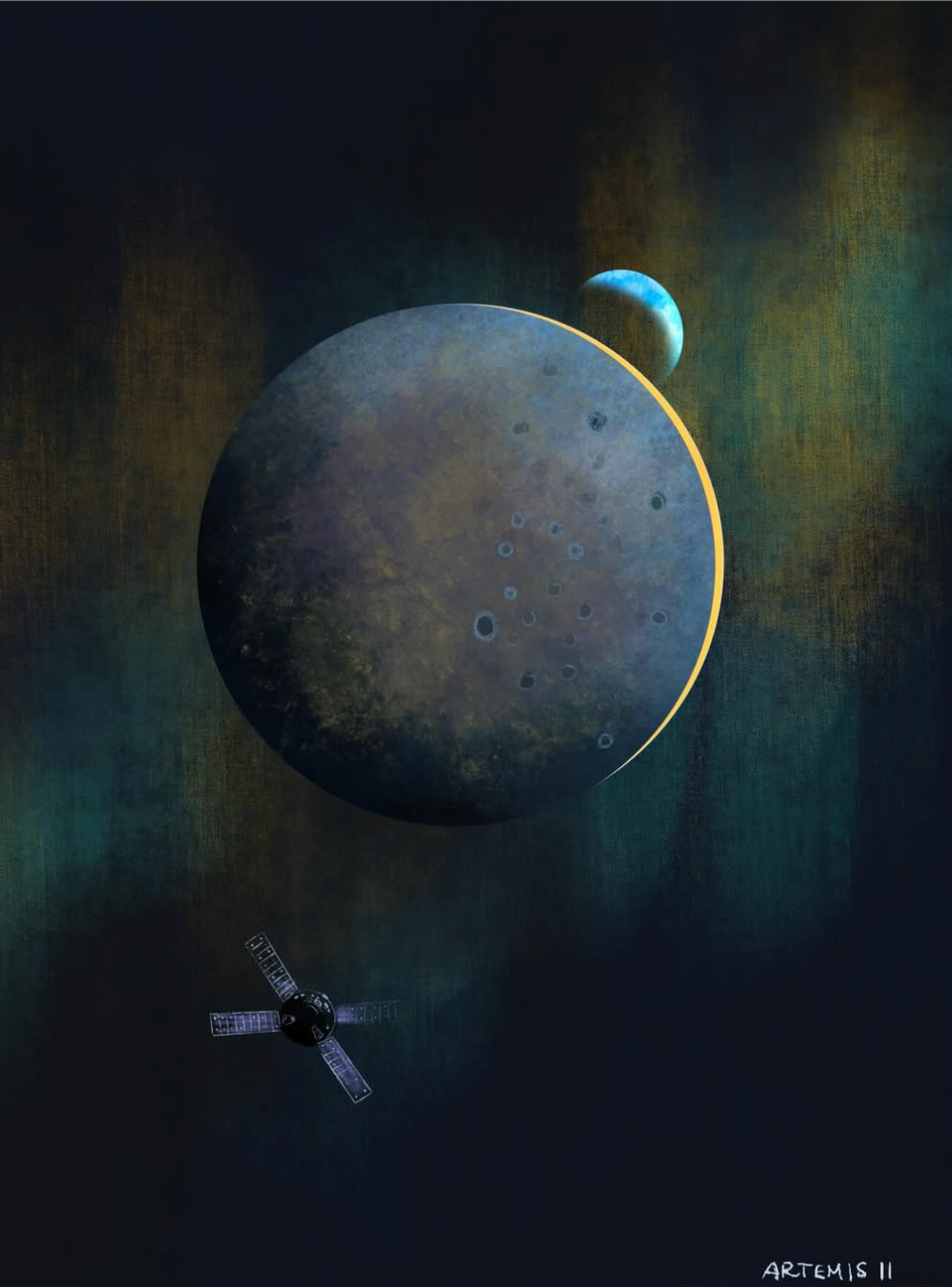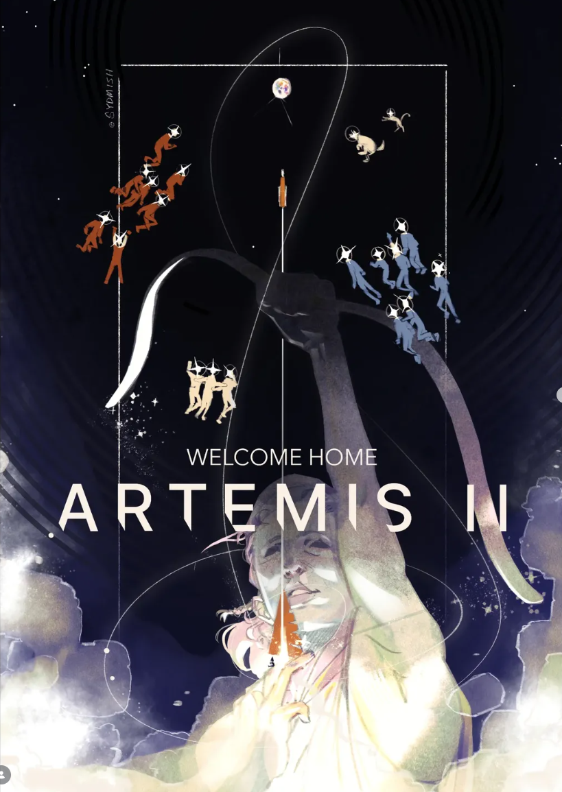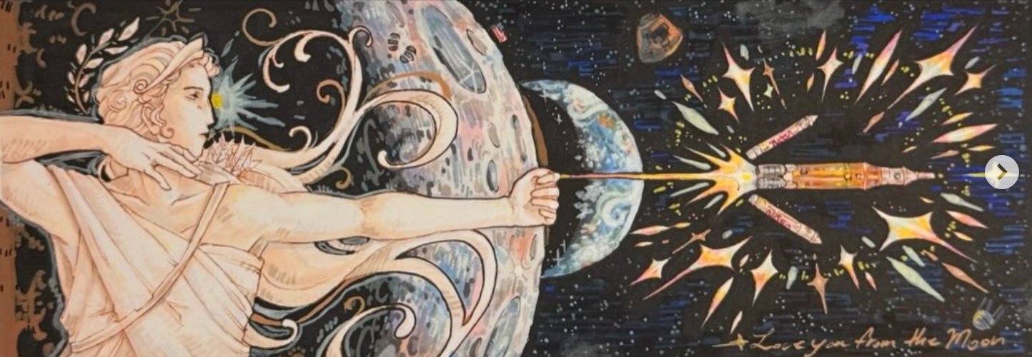 The recent Artemis II mission to the moon generated intense interest worldwide. And artists responded as the always do: by producing visually stunning and emotionally powerful work. I saw so much great art online that I wanted to gather some of my favorite pieces (before they disappeared into the unimaginably large digital ocean) so that others could see this wonderful art presented thematically. I made every effort to credit the artist where I could.